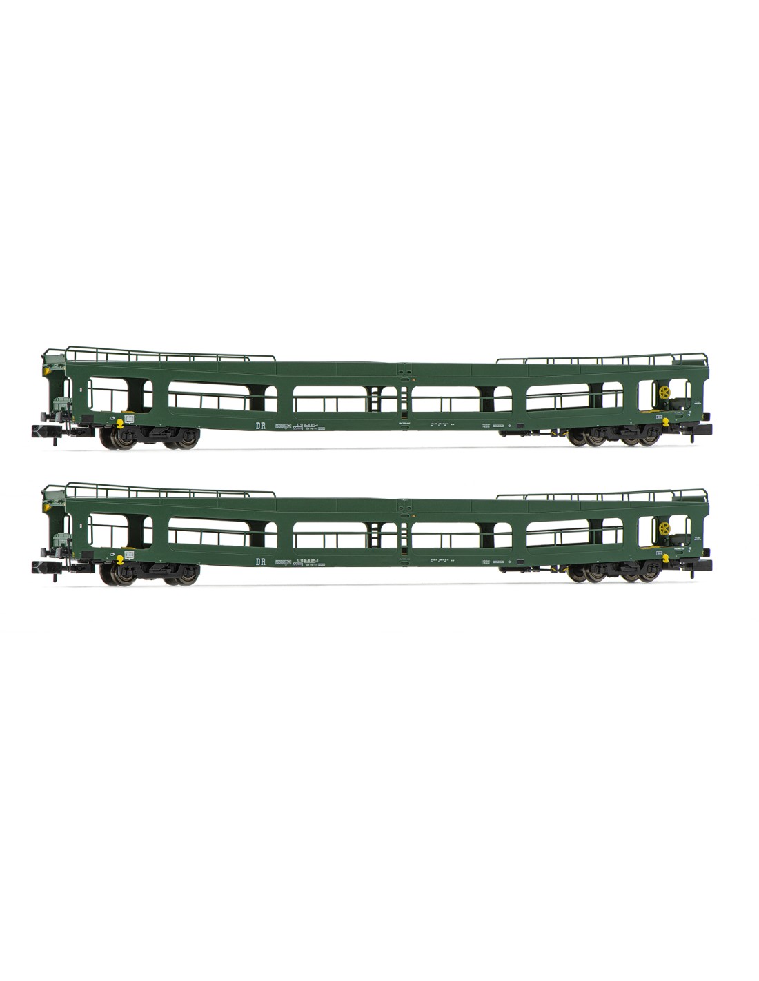 DR, SET DE 2 UNIDADES, VAGÓN PLATAFORMA DDm PARA COCHES,DECORACIÓN VERDE. ÉPOCA IV.